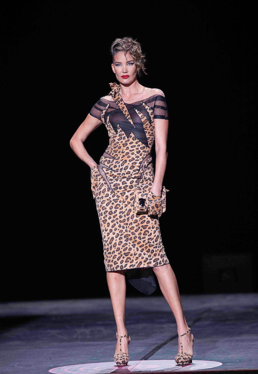 Sur le podium se succèdent une robe léopard audacieuse, une mini-robe en jean, une robe bustier structurée,