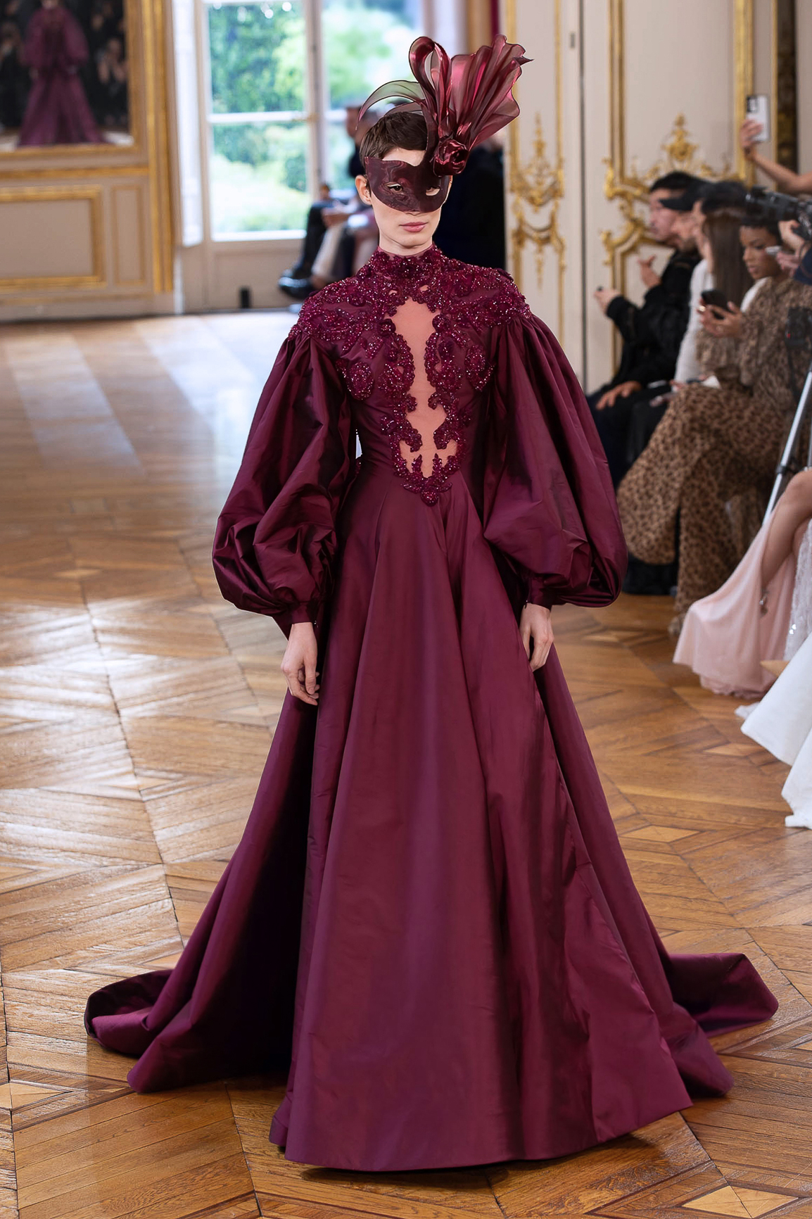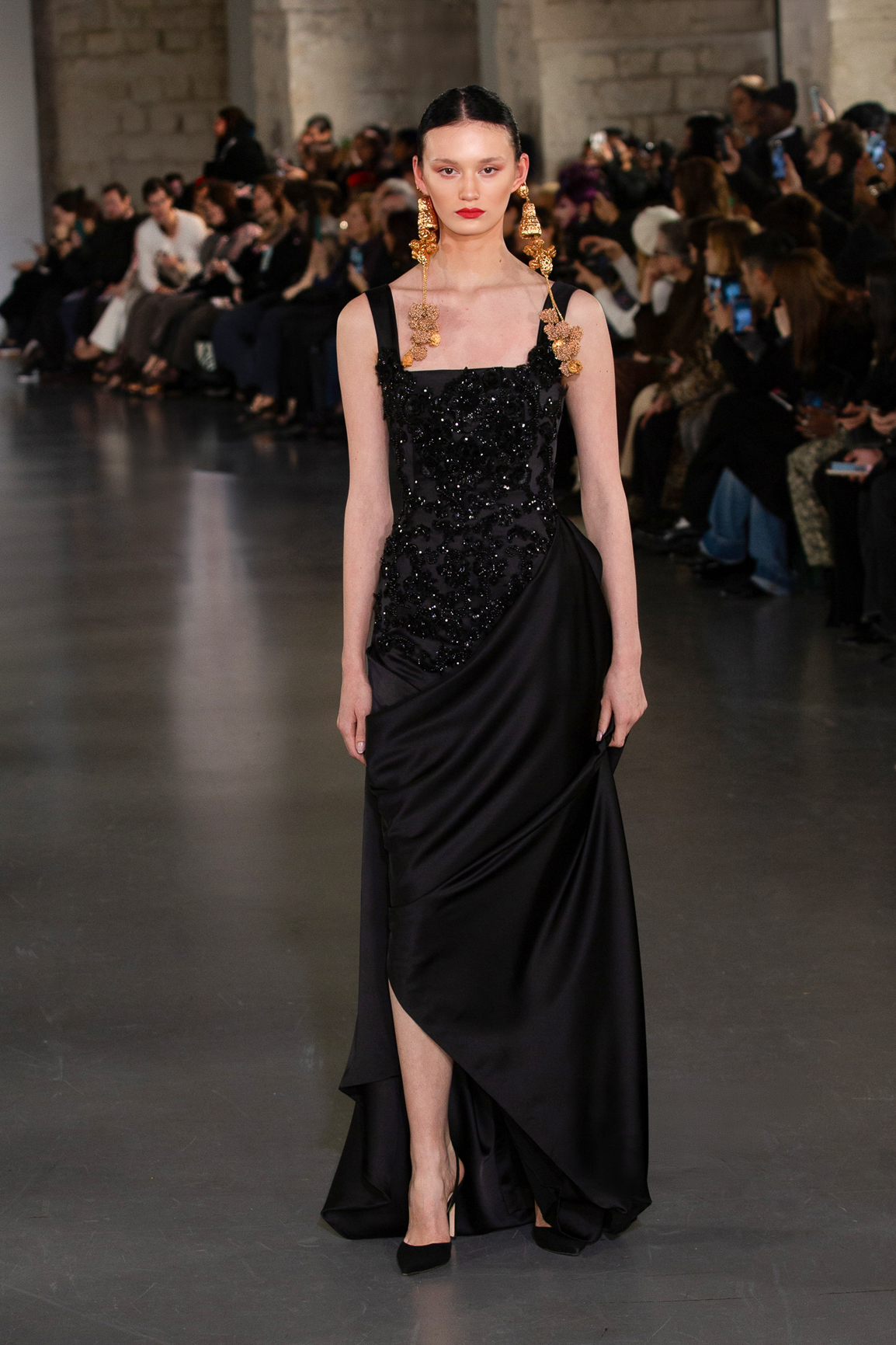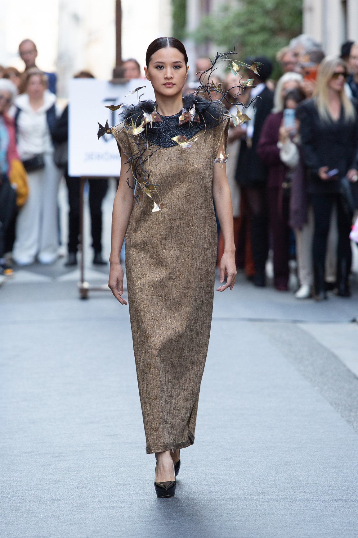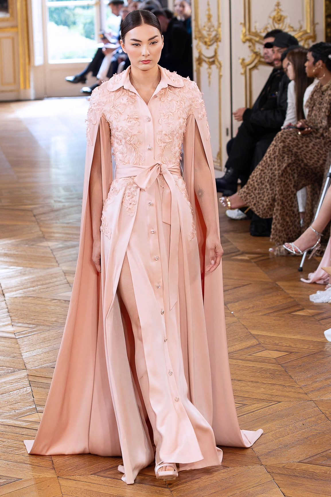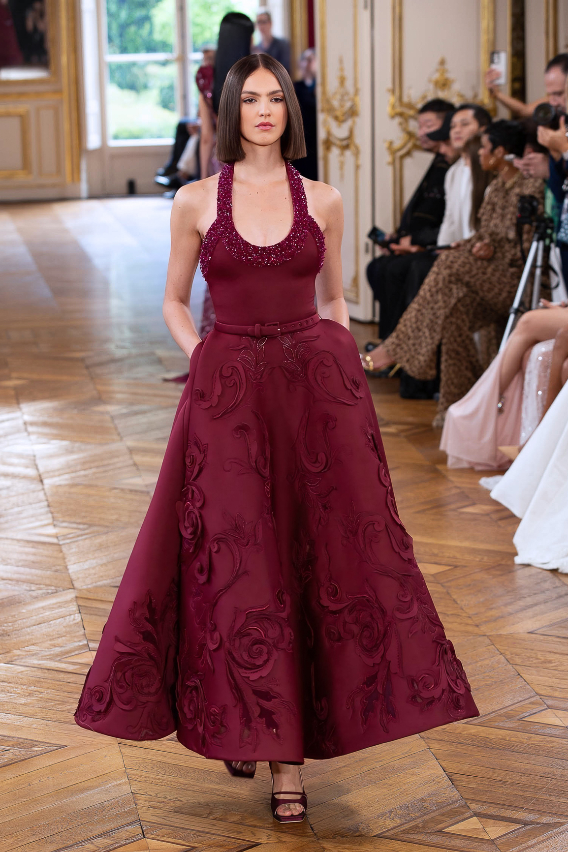 parfois moderne, incarnée par des mannequins à l’allure souveraine, la démarche lente, presque cérémonielle. Matières nobles et broderies d’exception.