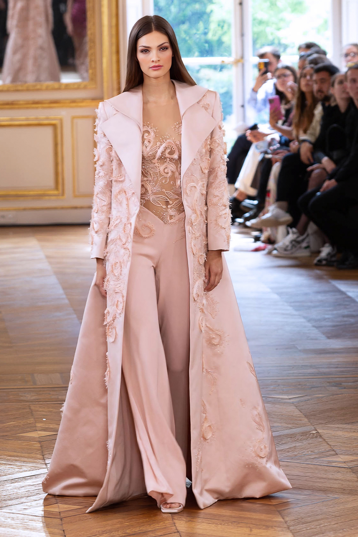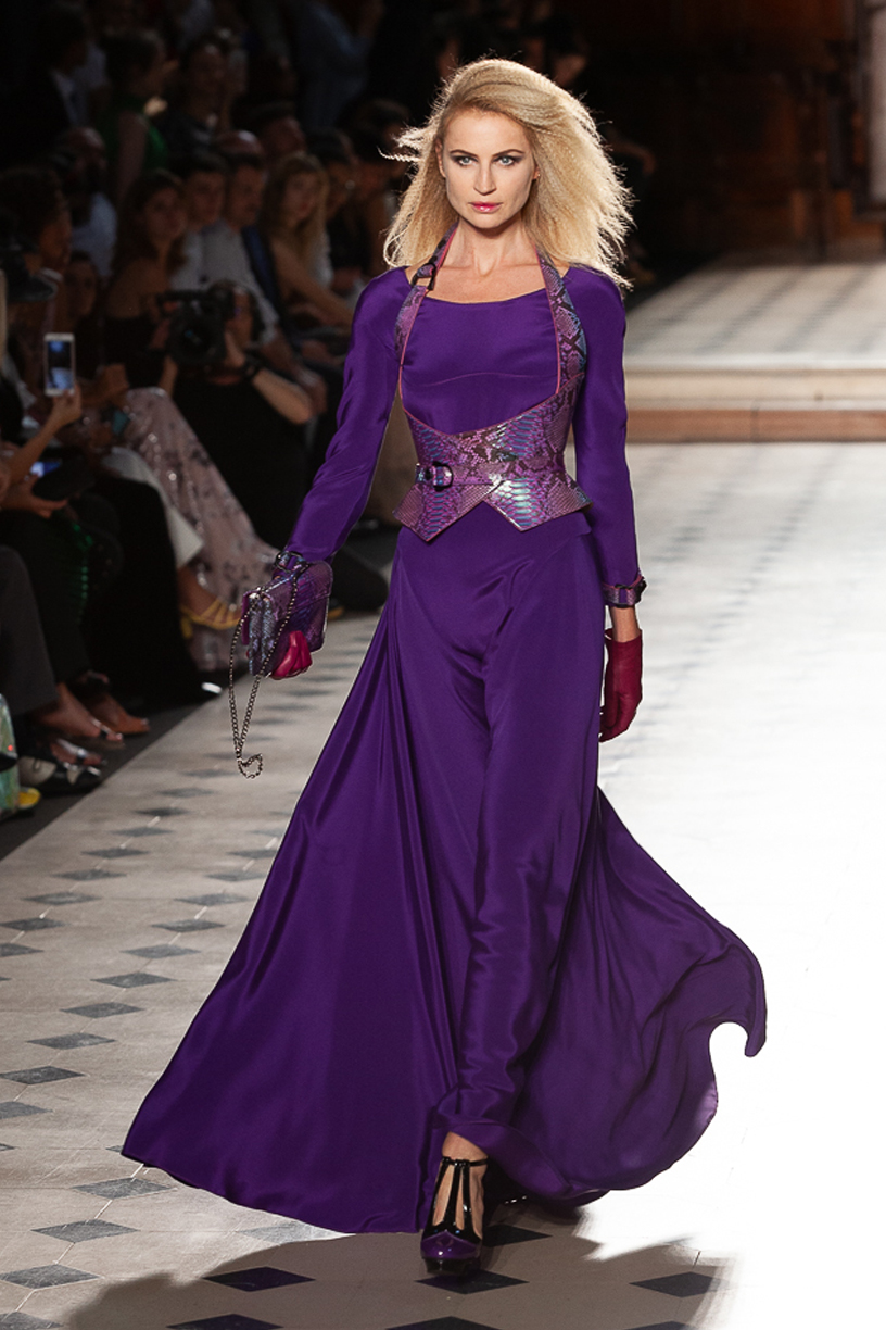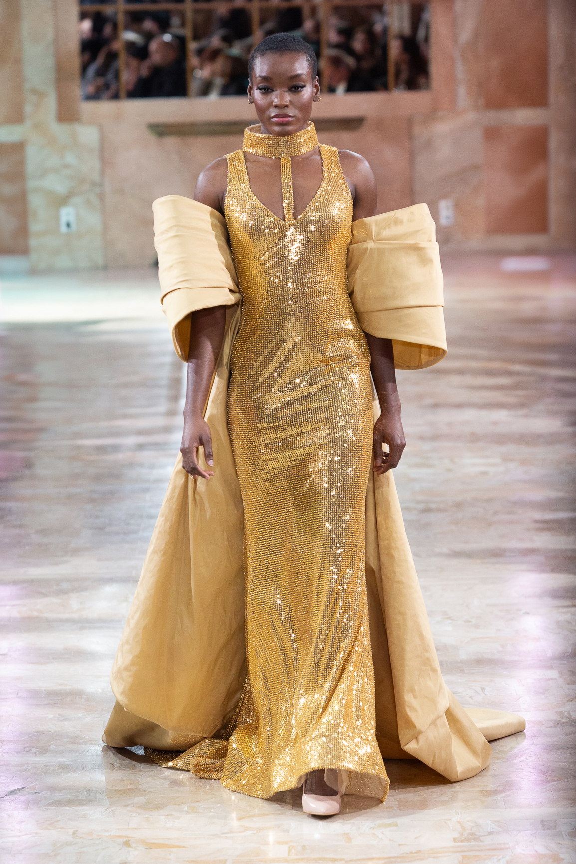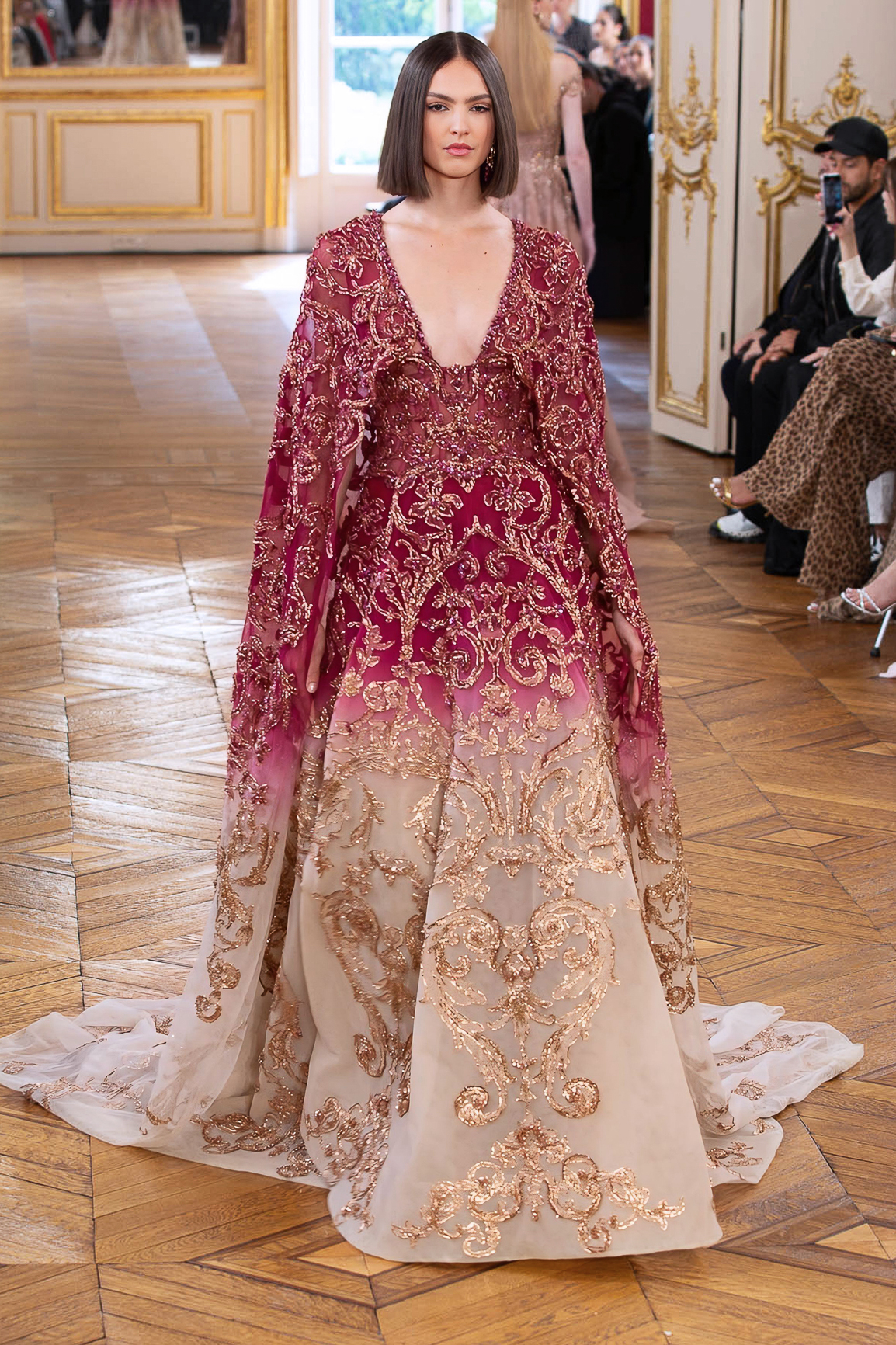 parfois moderne, incarnée par des mannequins à l’allure souveraine, la démarche lente, presque cérémonielle. Matières nobles et broderies d’exception.