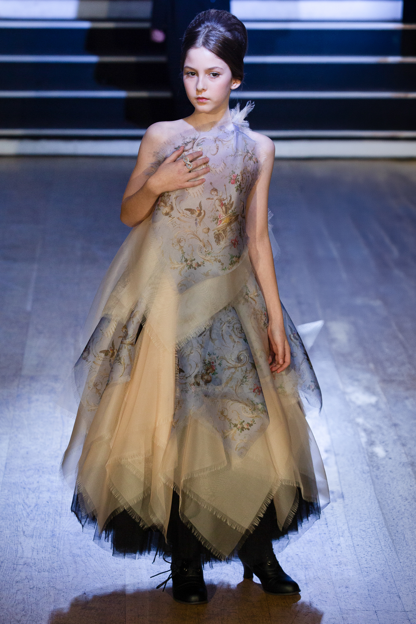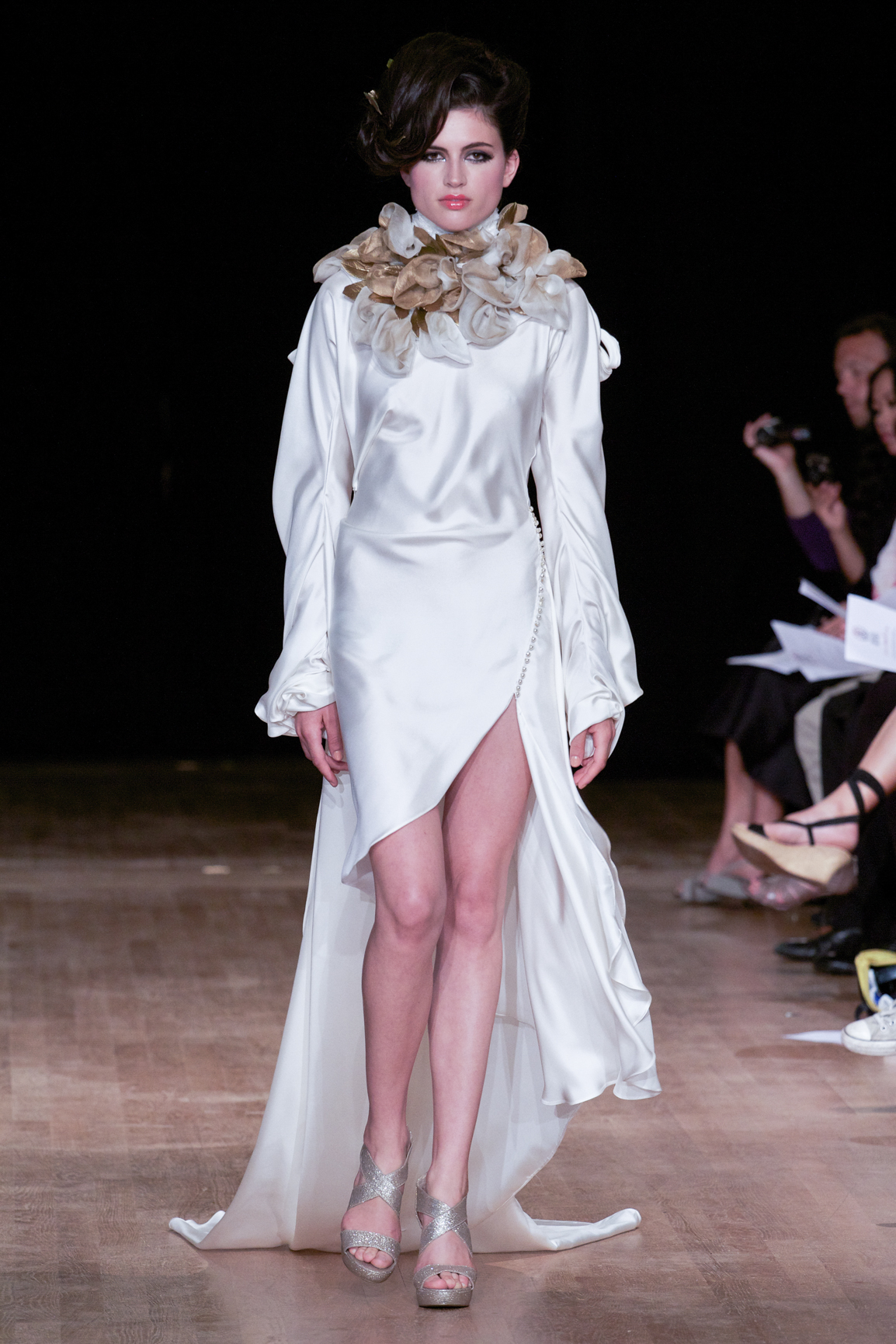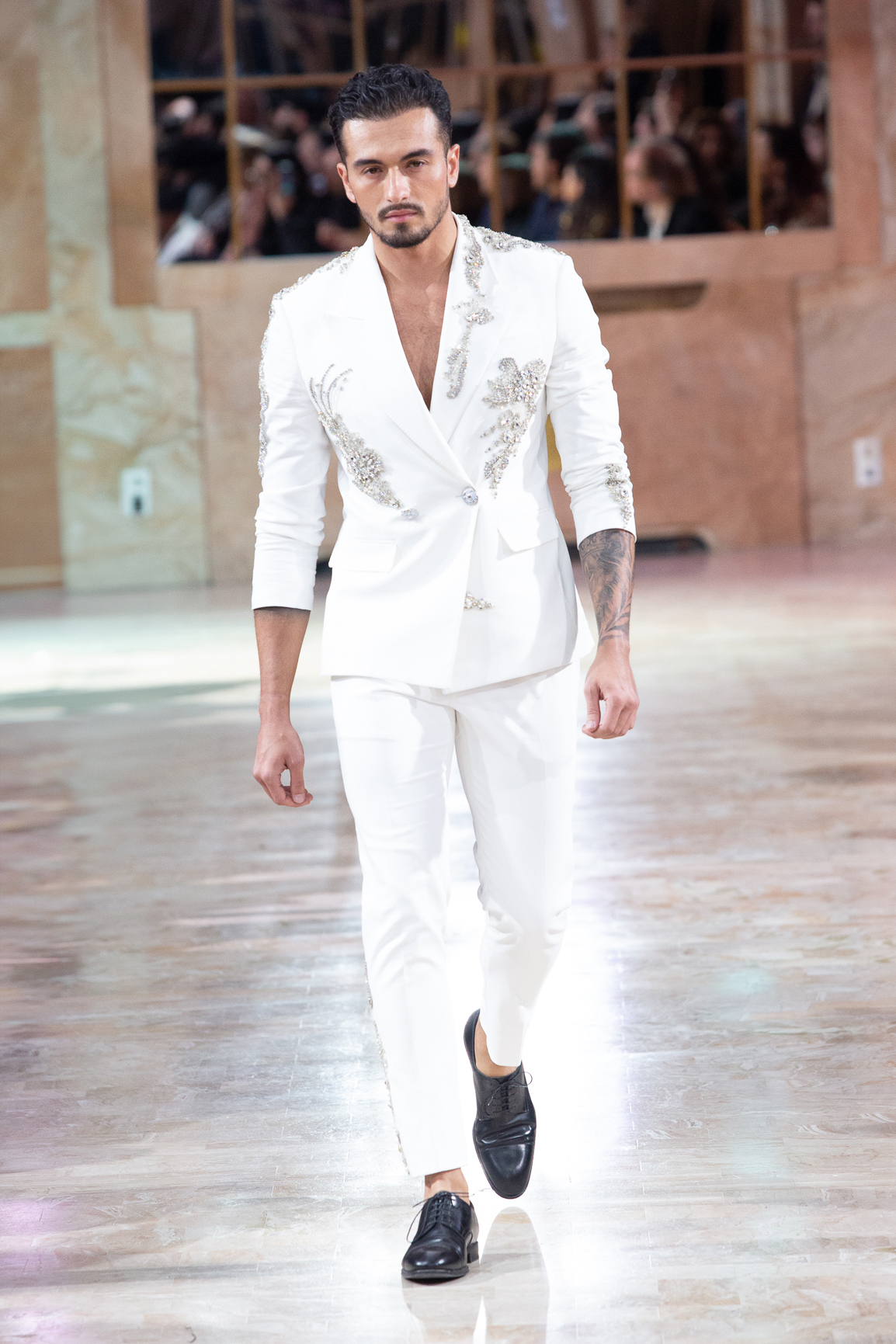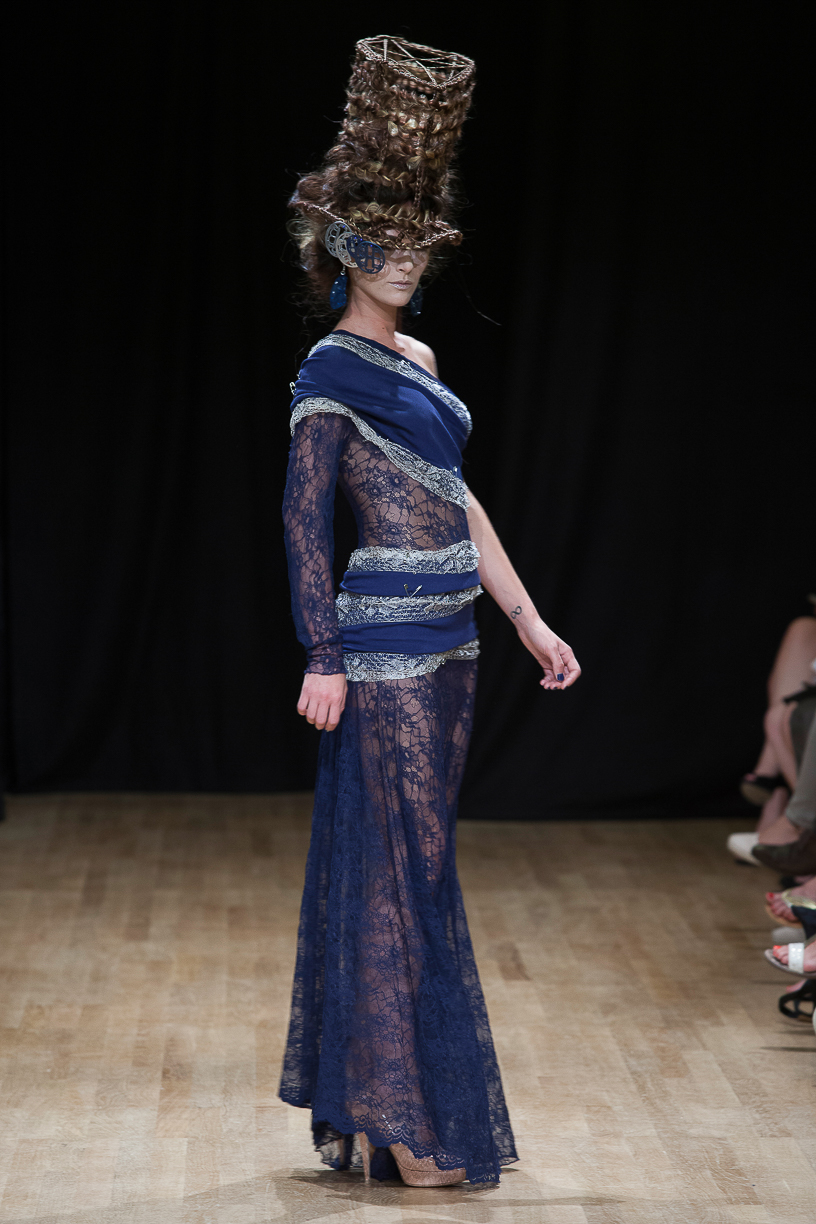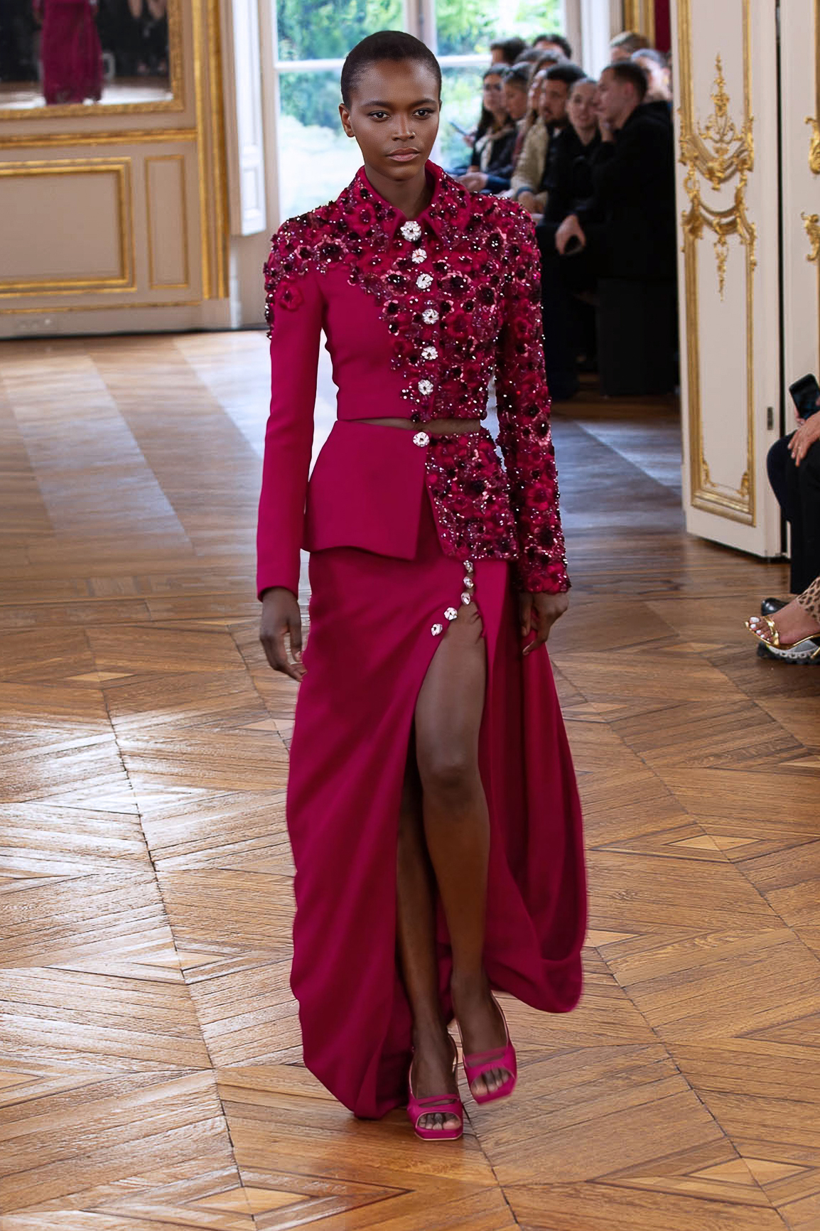 parfois moderne, incarnée par des mannequins à l’allure souveraine, la démarche lente, presque cérémonielle. Matières nobles et broderies d’exception.