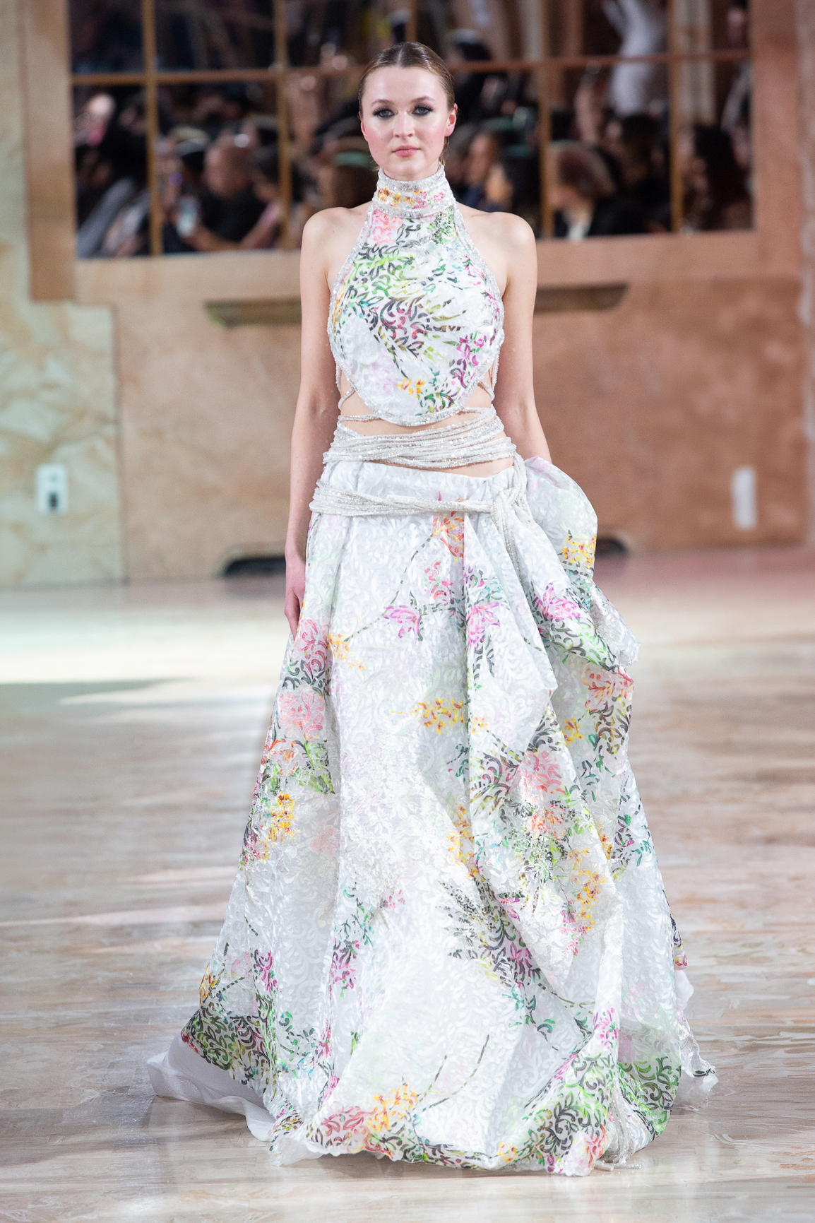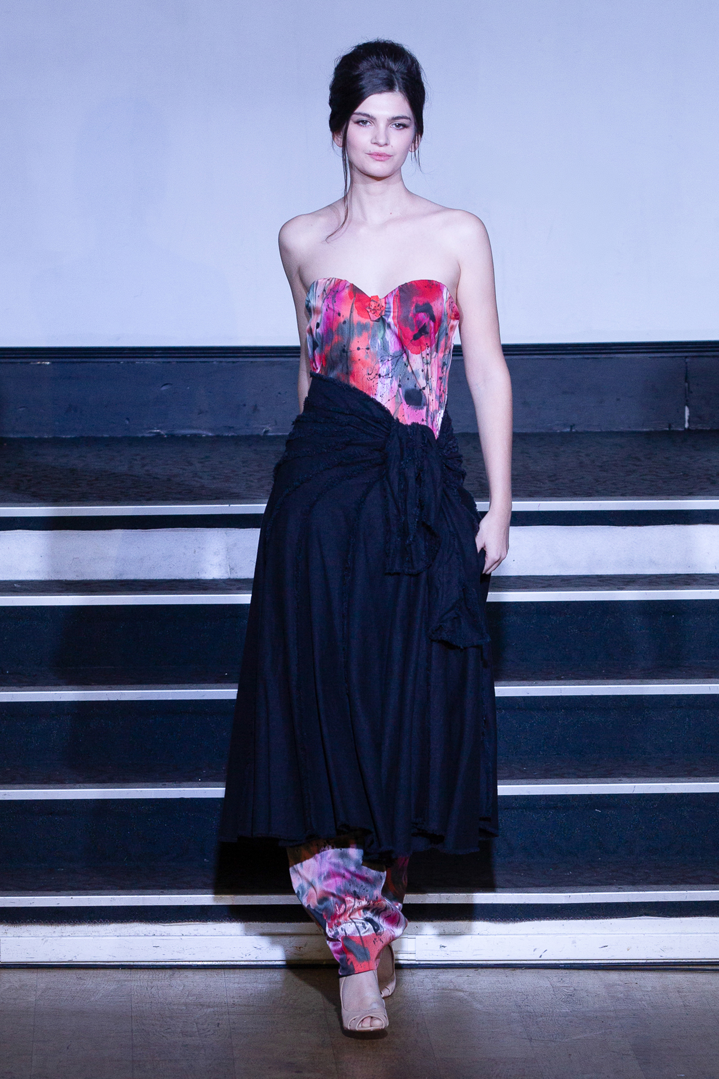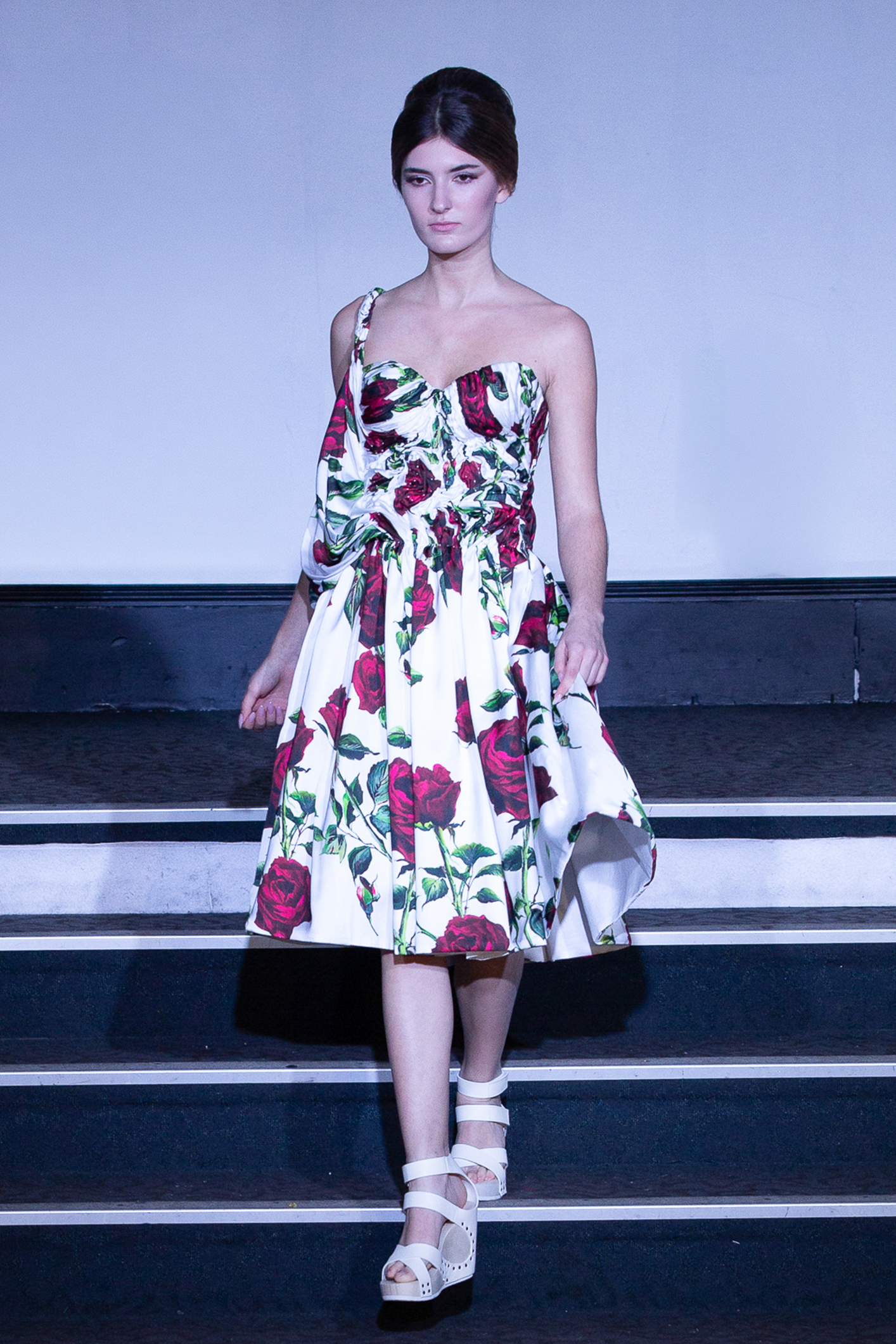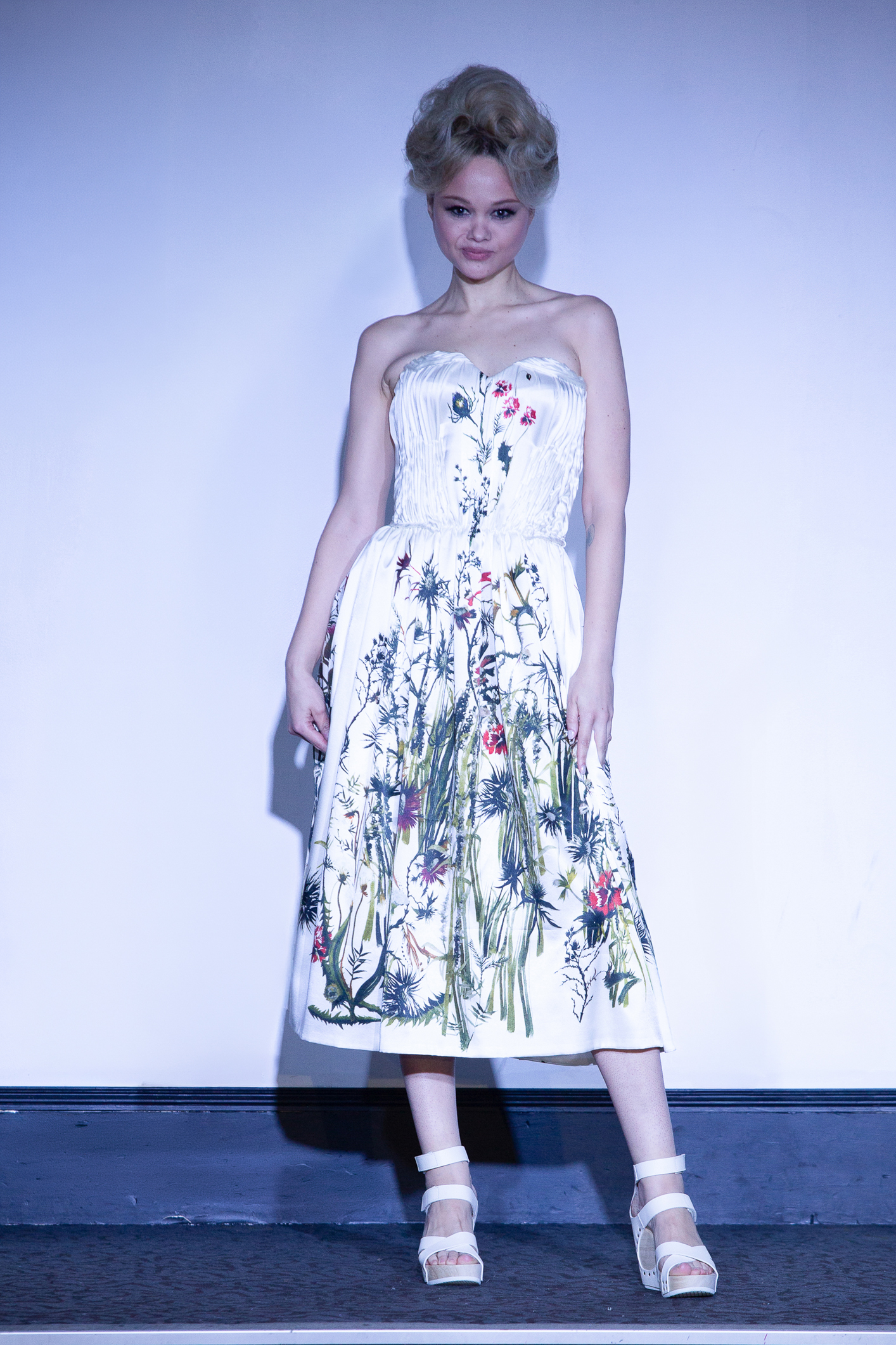 Une mannequin arborait une robe bustier imprimée de roses rouges, attirant immédiatement les regards.