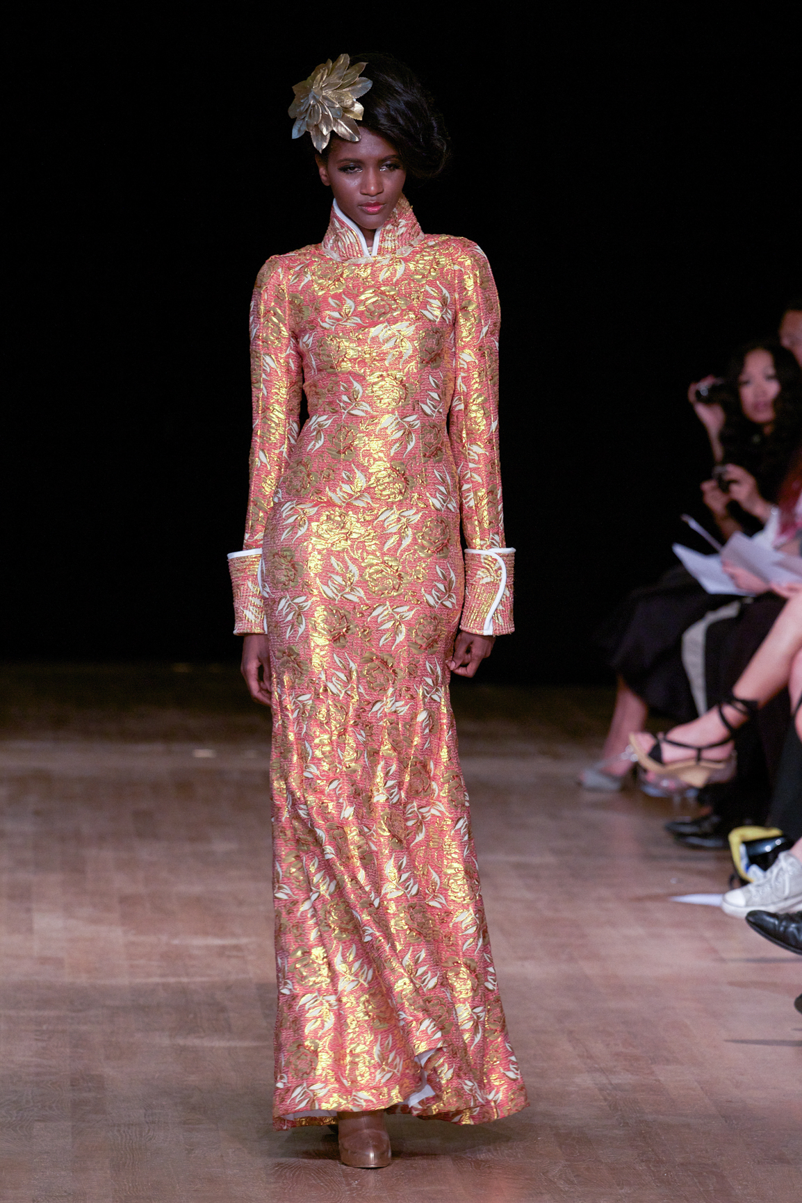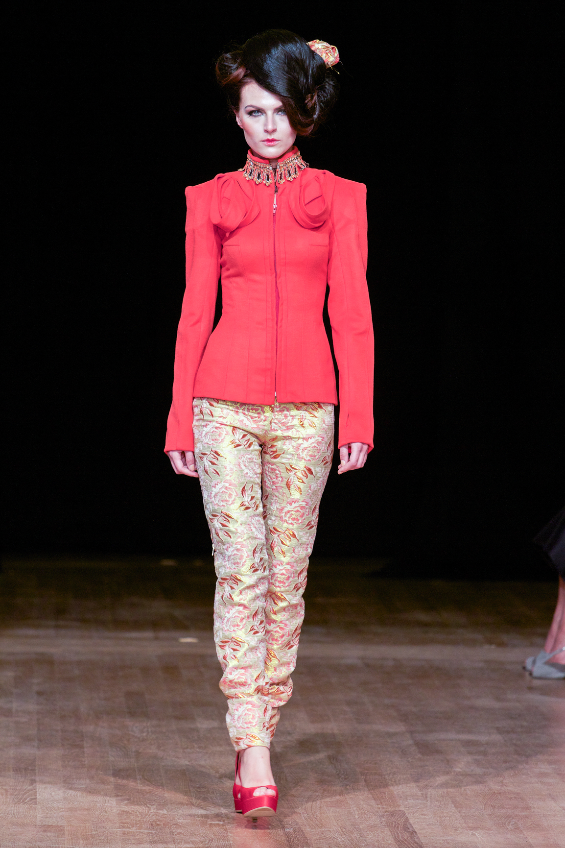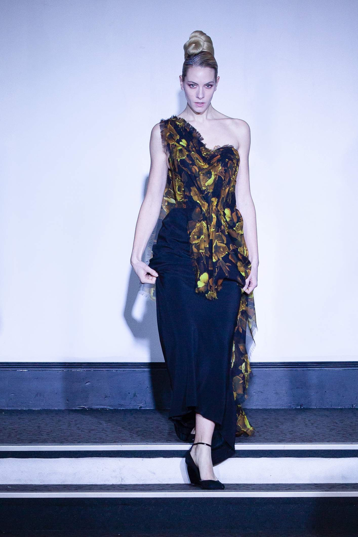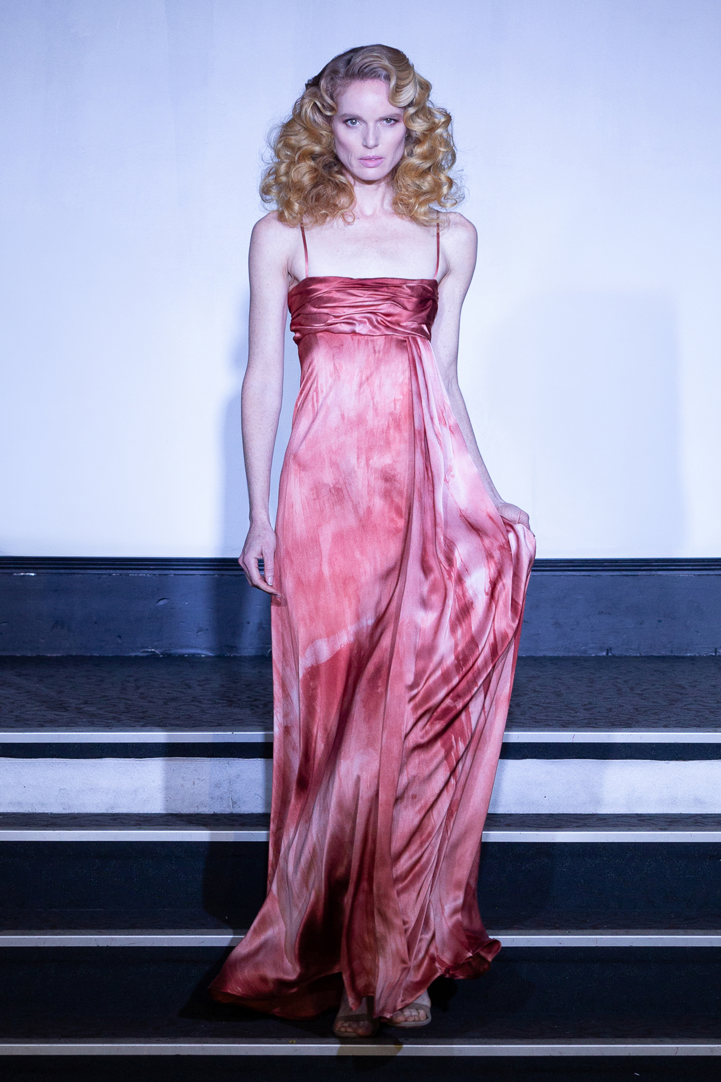 Une mannequin arborait une robe bustier imprimée de roses rouges, attirant immédiatement les regards.