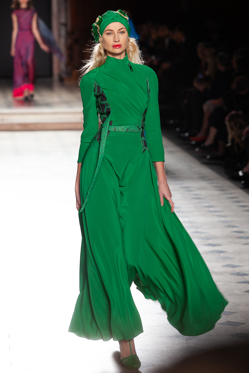 Les silhouettes se parent de robes de soirée en soie aux teintes vertes, violettes et kaki.