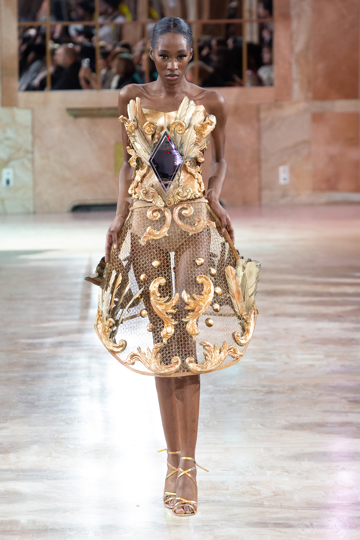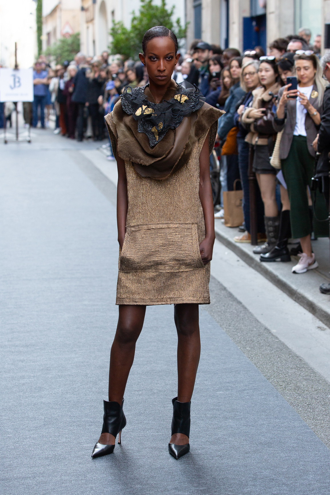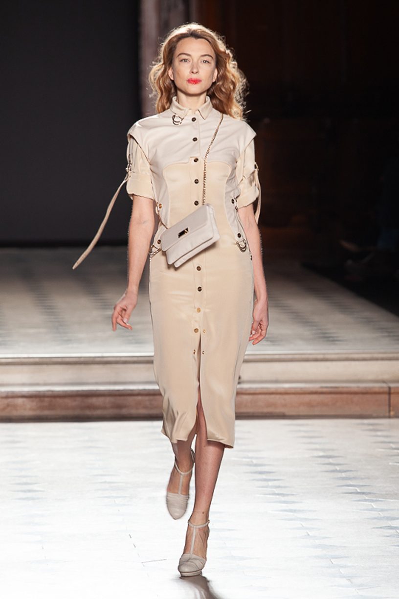 Sur le podium se succèdent une robe léopard audacieuse, une mini-robe en jean, une robe bustier structurée,