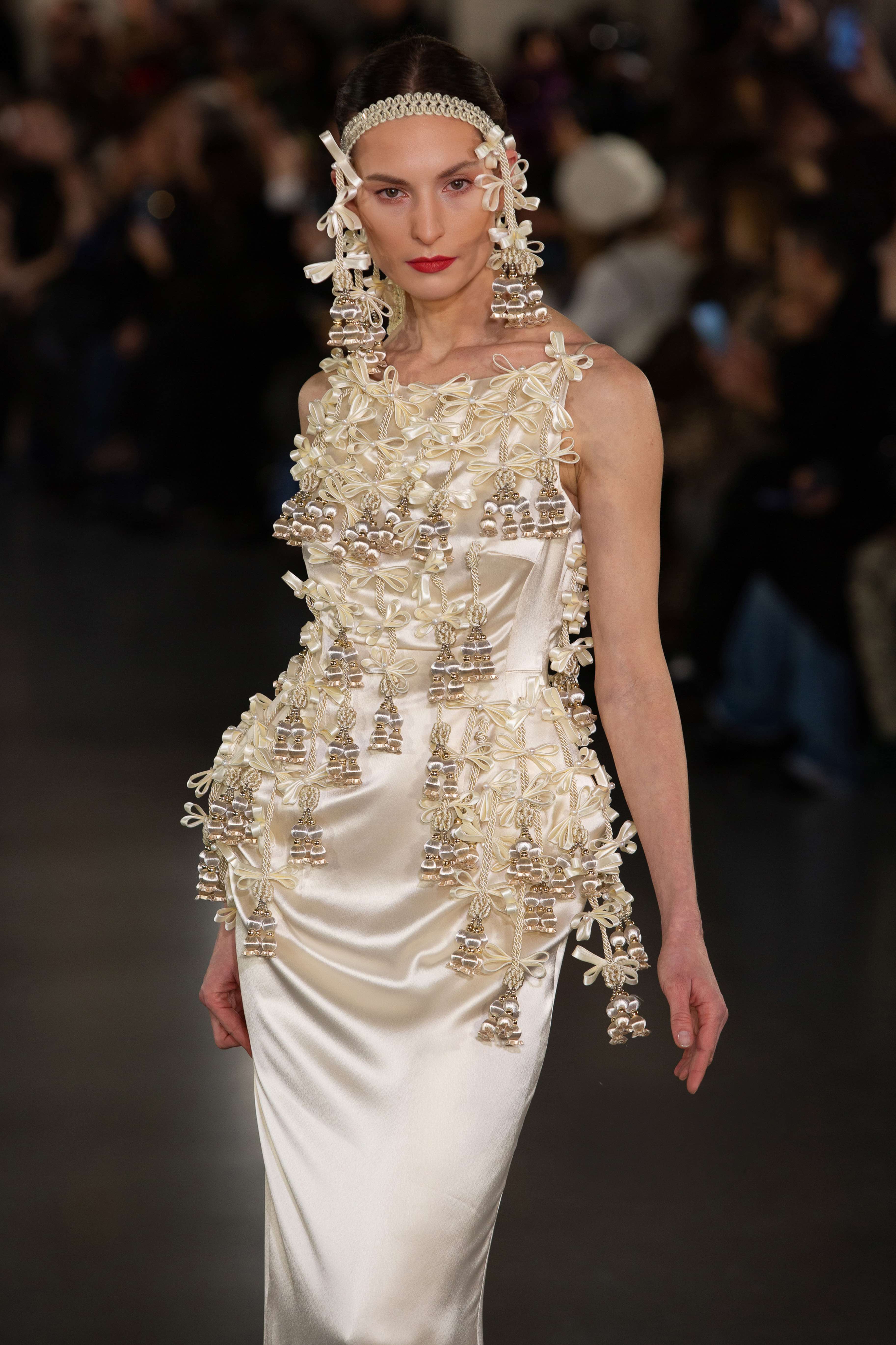 Chaque silhouette semble sortie d’un rêve : broderies minutieuses, dentelles sculptées, volumes théâtraux et coupes architecturales se