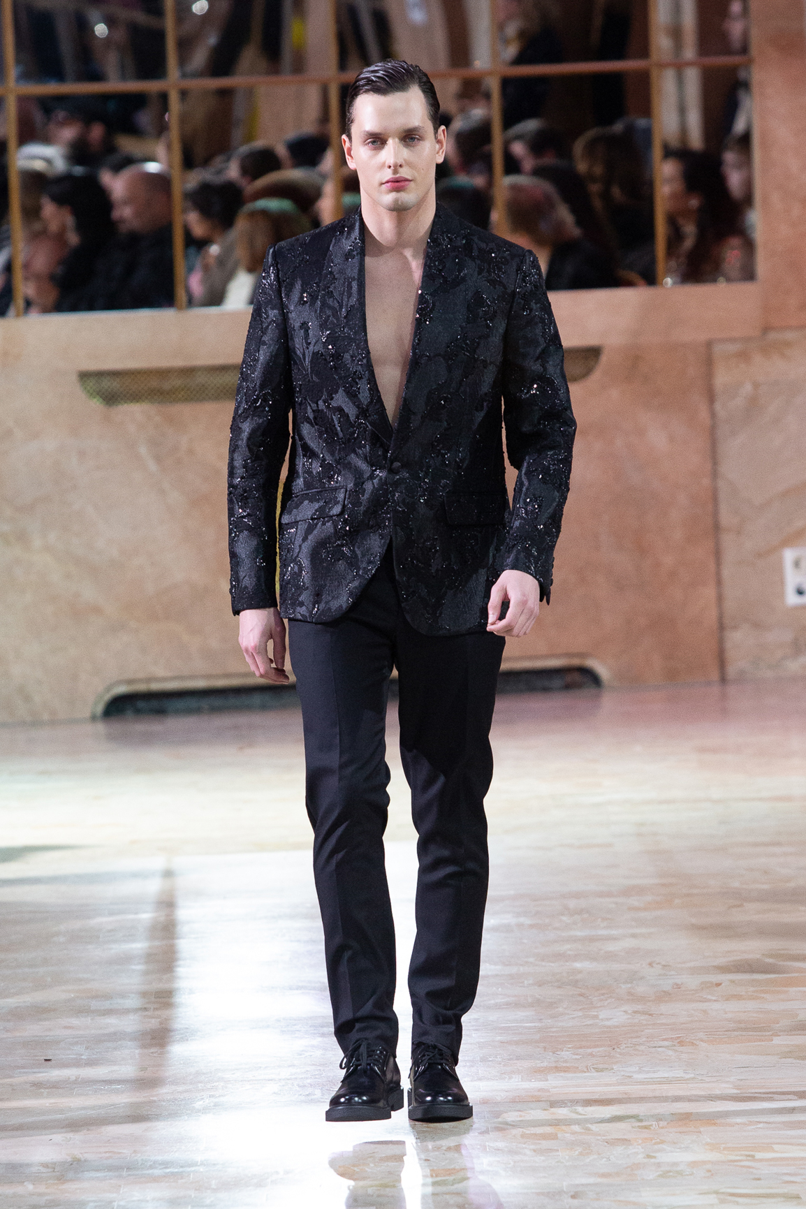apportant une dimension théâtrale à la présentation. Deux mannequins ont également esquissé quelques pas sur des rythmes rock, parfois pop, insufflant une énergie moderne à l’ensemble.