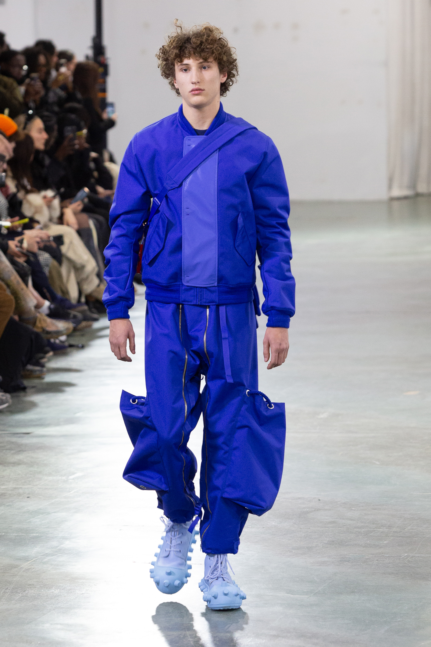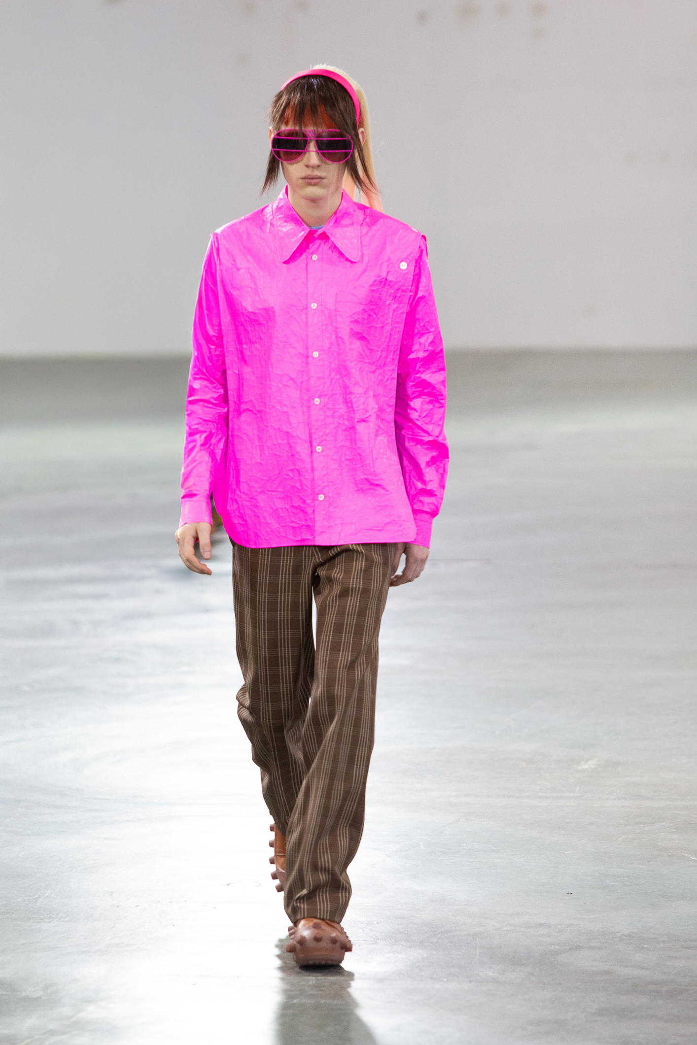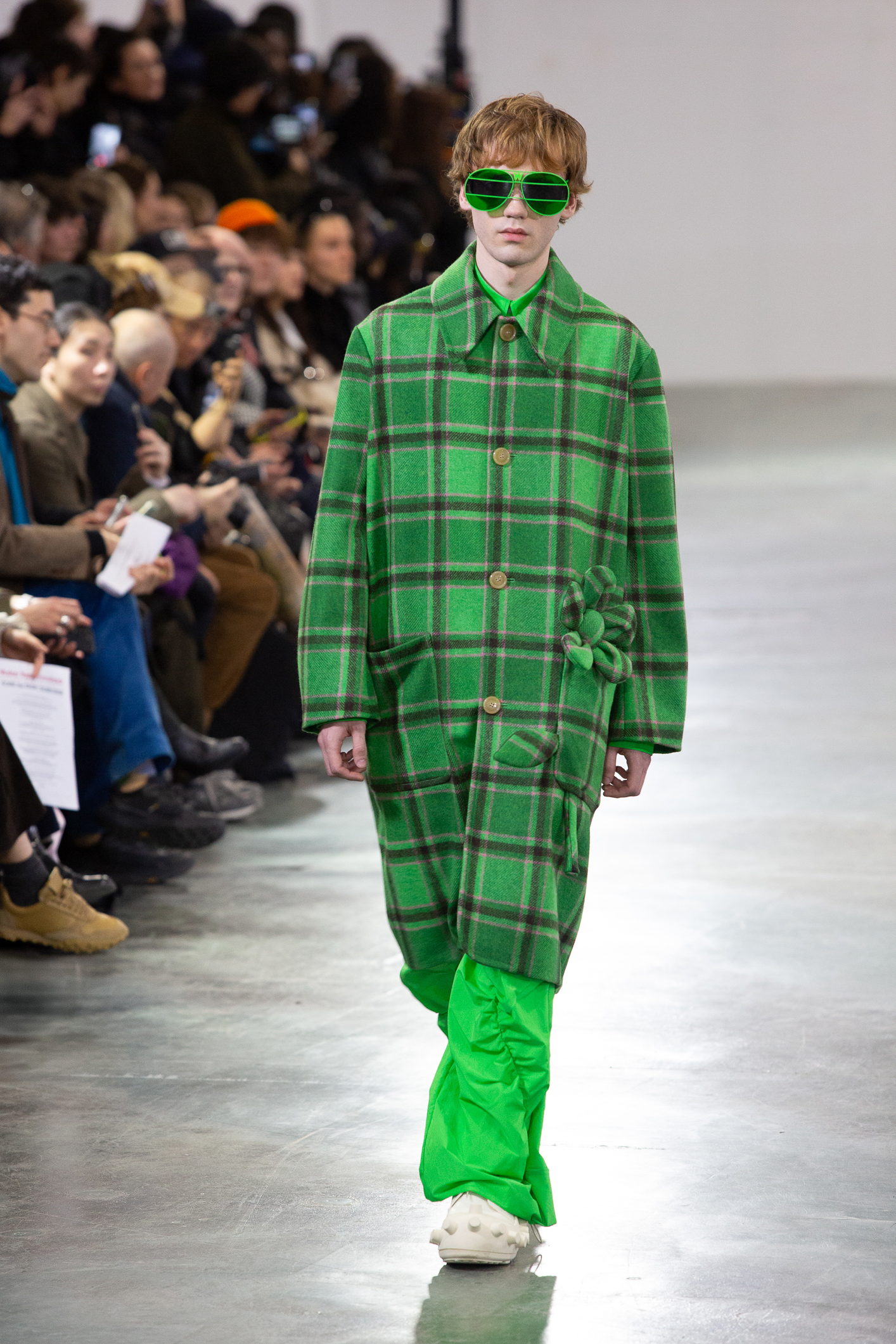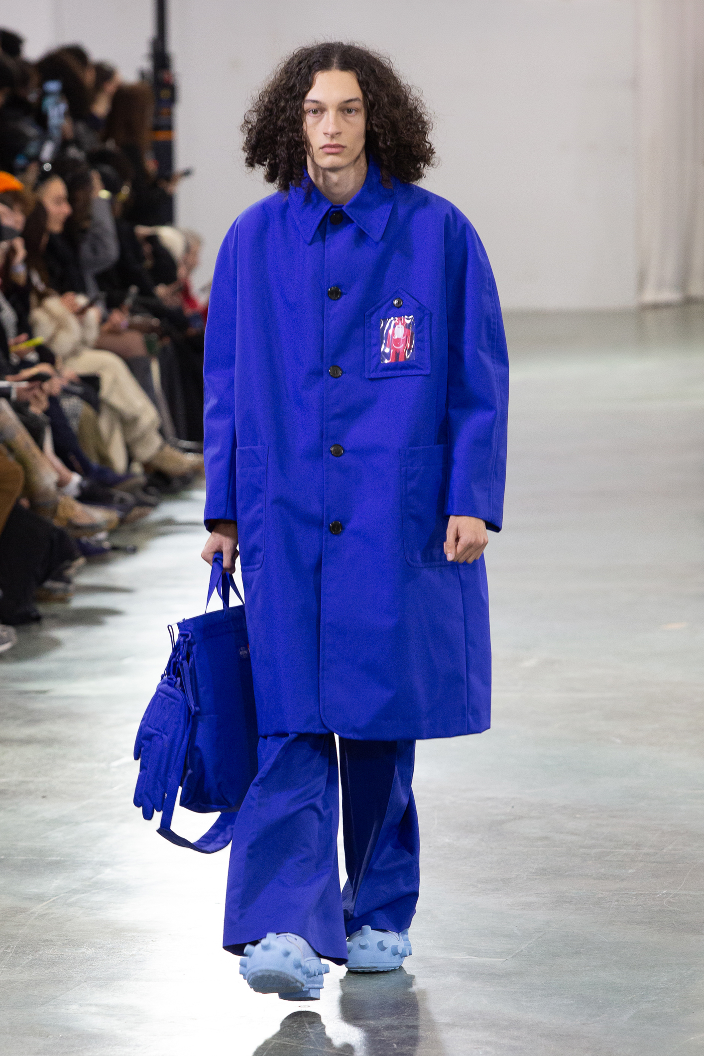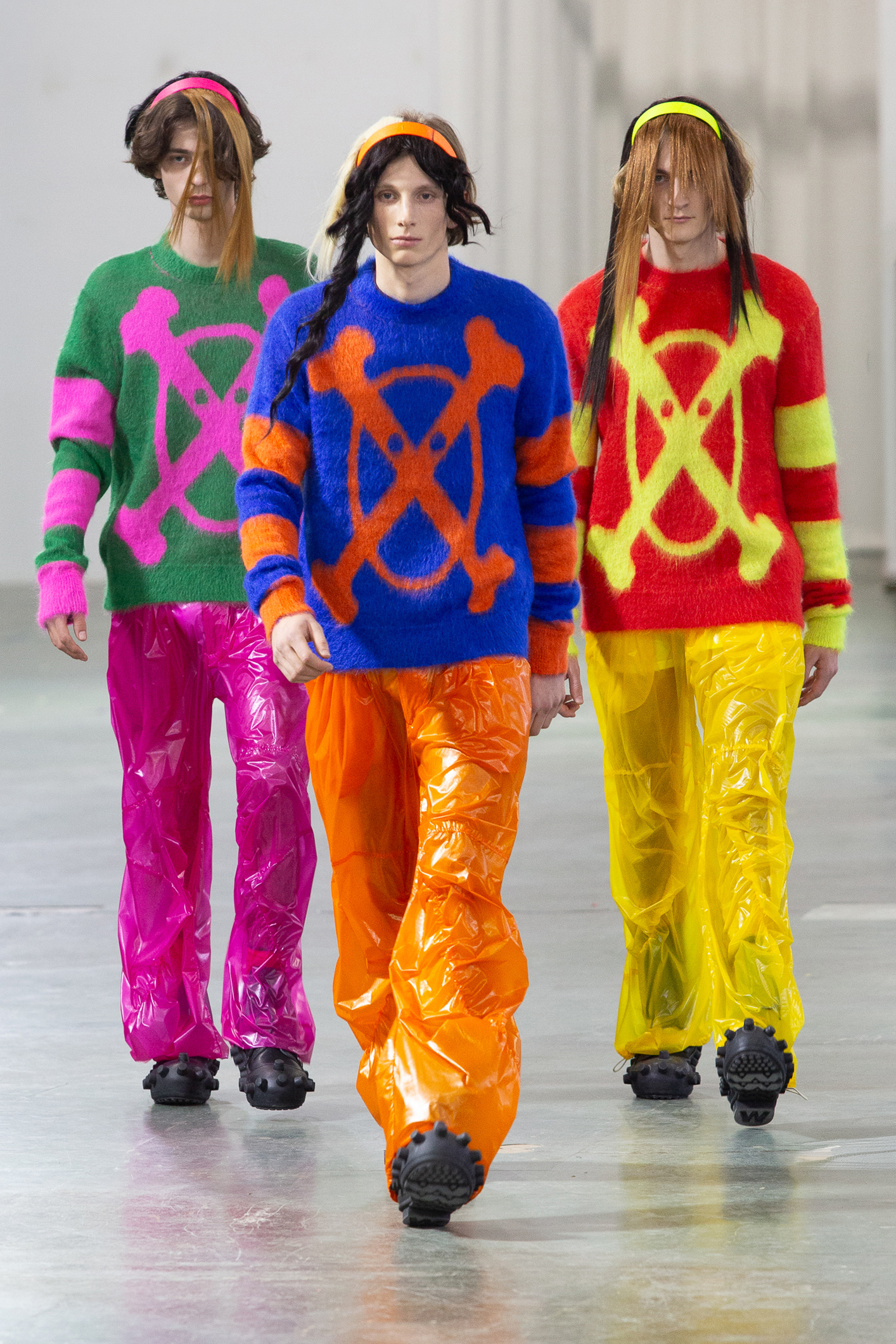 Les accessoires complètent cet univers créatif : chaussures aux couleurs uniques ponctuées de petites formes rondes,