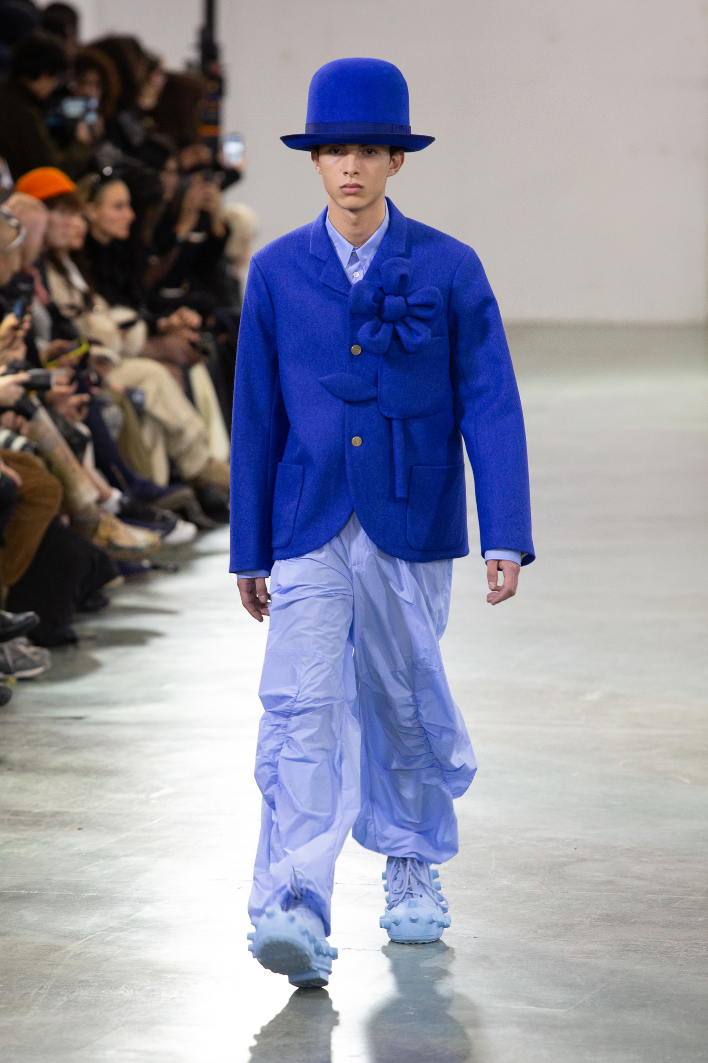 d’un chapeau melon qui apporte une touche de caractère. Les pulls tagués et les pantalons amples affirment une esthétique urbaine et moderne.